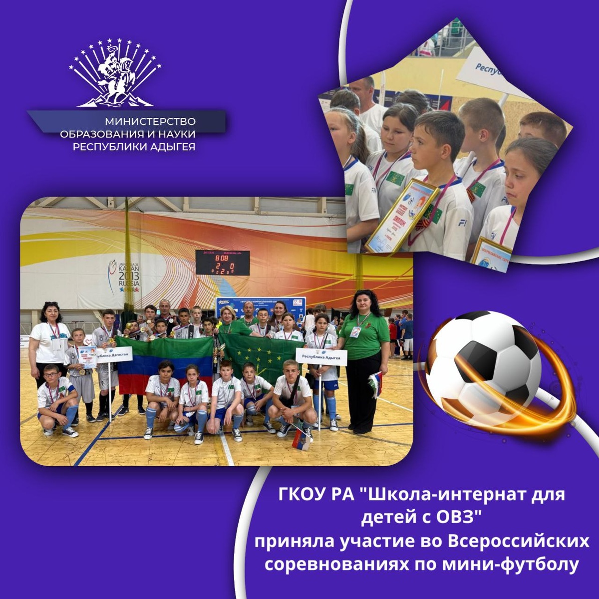Ученики ГКОУ РА "Школа-интернат для детей с ограниченными возможностями здоровья" приняли участие во Всероссийских соревнованиях по мини-футболу в Казани в рамках проекта «Футбол в коррекционной школе»! В этом году соревнования собрали 38 команд из разных уголков страны.