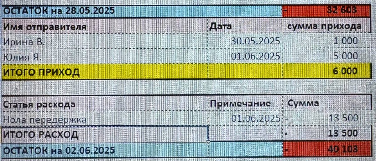 #Отчет 02.06.2025 Благодарим Вас 🙏 за помощь хвостикам 🐕🦺🐕🦺🐕🦺🐕 Собираем средства на погашение долга и оплату передержки на июнь месяц 🙏 Ханни оплачена финкуратор Клавдия оплачена Нола 13500 оплачена передержка - занятия с кинологом отменили на время Новая передержка с учётом питания/корма Рая 9500 Хлоя 9500 ‼️ еженедельно можно поехать и познакомиться с хвостиками ❗️ актуальна помощь в поиске семьи для хвостиков Карты привязаны к номерам телефонов: +7 985-977-03-22 Альбина (Сбер, Тинькофф) +7 916-069-34-82 Елена (Сбер) Подпись: «для собак» или «благотворительность»