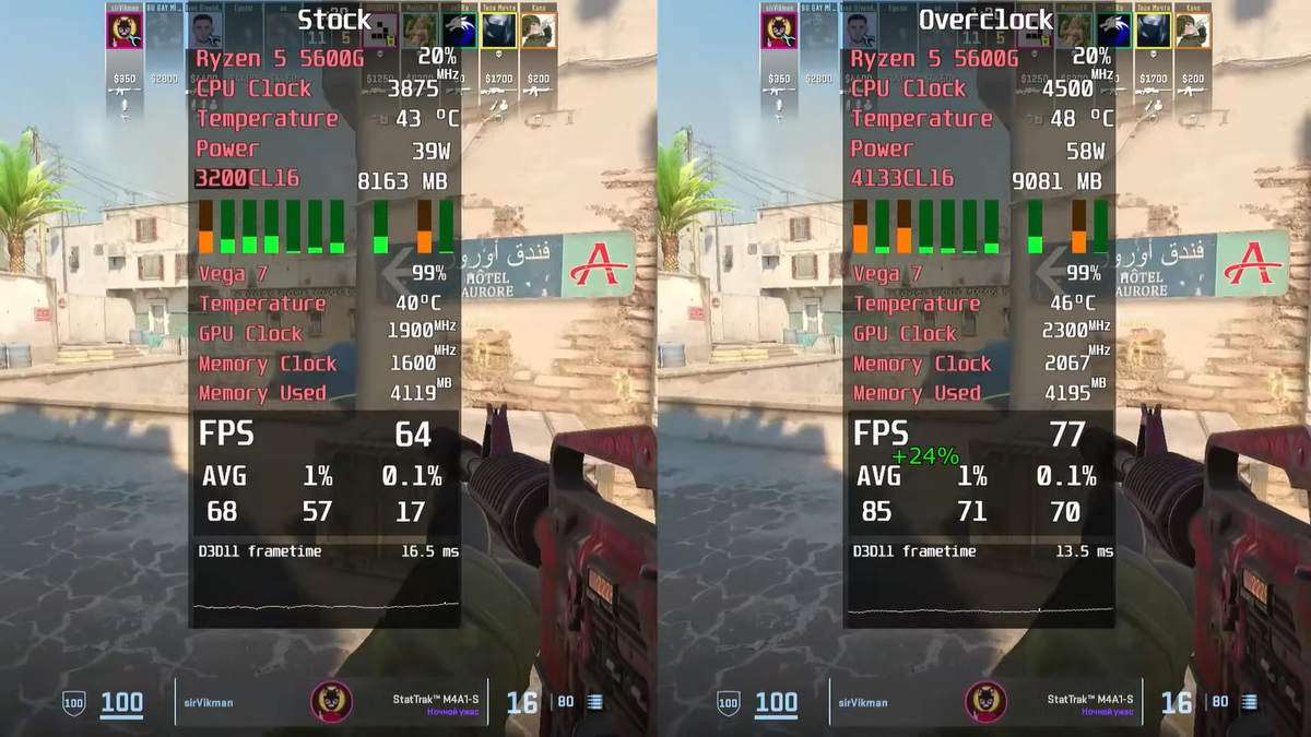 Средняя частота кадров с Ryzen 5600G без разгона составляла всего 36 к/с, с ним - 46 к/с.