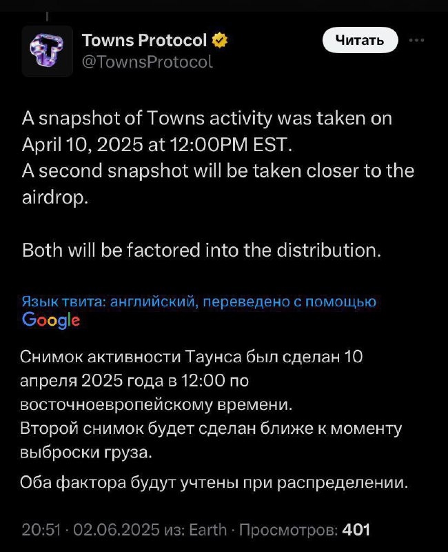 #TOWNS #AIRDROP 📸2 СНЕПШОТА. НИКОГО НЕ НАПОМИНАЕТ❓ ZORA Свои задержки с выходом и отсутствие информации решили с помощью двух снимков 9/10 проектов сейчас абсолютно наплевательски относятся к ранним последователям и велика вероятность, что за попадание в снимок №1 бонус будет чисто символический Что ж, посмотрим что из этого выйдет, но уже были сливы, что будет 2 варианта клейма: сразу со штрафом и с вестингом, но 100% Как бы то не было, я думаю, что после Movement все знают какой вариант стоит выбирать ✅ SaversNotes | Чат | 🎥YouTube 💎 Tangem | ADS | 🔎 OKX | 💸Обменник | 🤓NANSEN