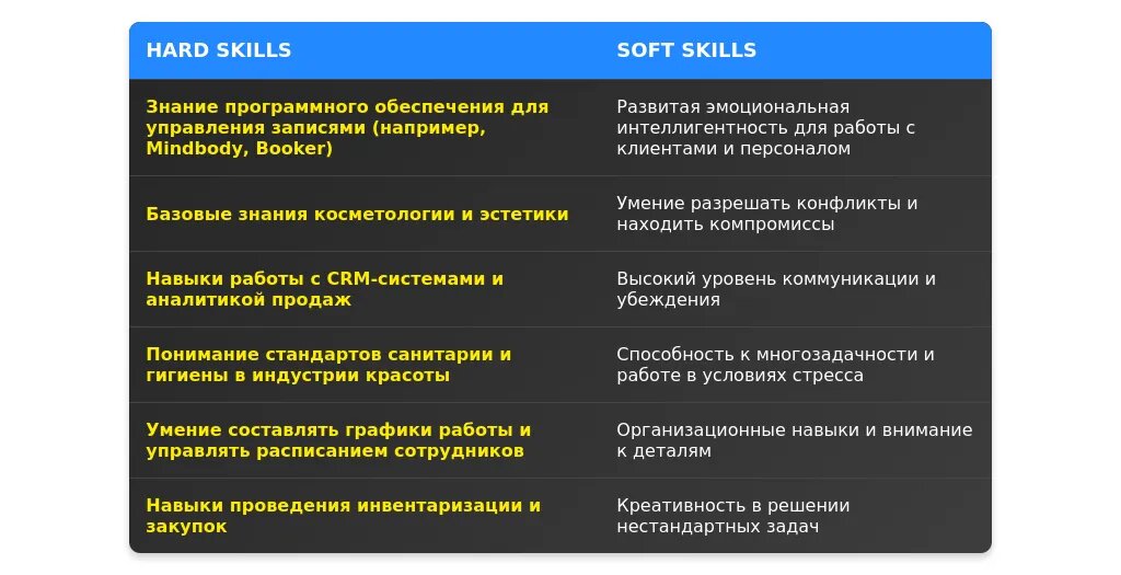 - Профессиональные навыки (например, управление расписанием, работа с клиентами).