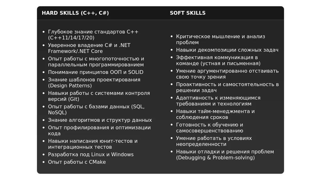 - "Знаю C++" → Лучше: "Продвинутый уровень владения C++: разработка многопоточных приложений, оптимизация производительности."