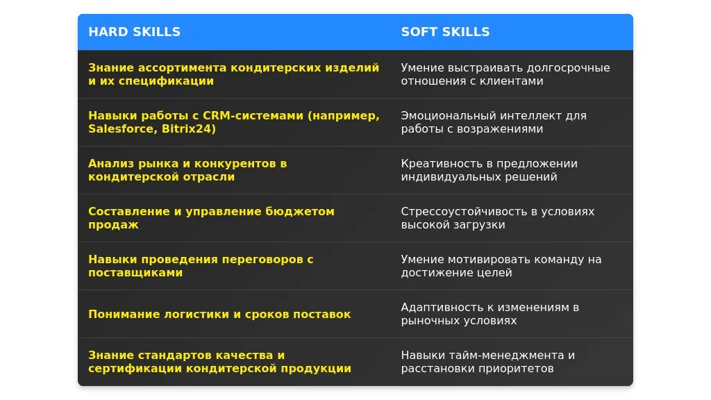После адаптации: "Опыт работы с кондитерскими изделиями, знание CRM-систем, навыки ведения переговоров."