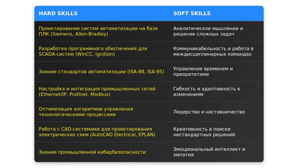 В разделе "Навыки" важно перегруппировать компетенции так, чтобы они соответствовали требованиям вакансии. Например, если в вакансии упоминается знание SCADA-систем, поставьте этот навык на первое место. Используйте ключевые слова, такие как "проектирование АСУ ТП", "разработка технической документации", "внедрение SCADA".