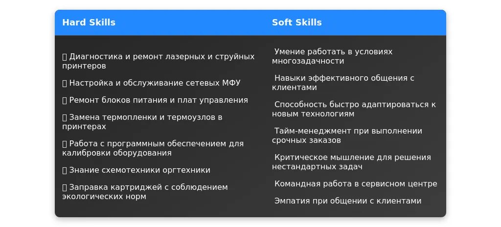 Пример 1 (после адаптации): "Ремонт принтеров и МФУ, знание программ диагностики, навыки работы с клиентами".