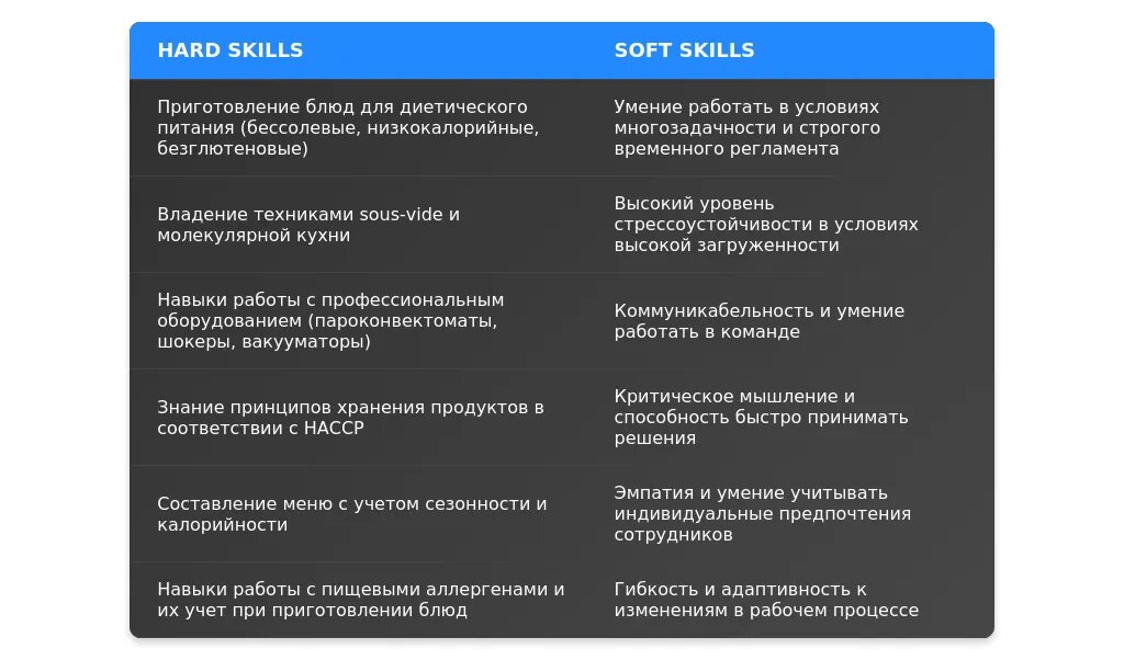 Анализ: Обязательные требования — знание диетического питания. Скрытые требования — умение адаптировать меню под потребности персонала.