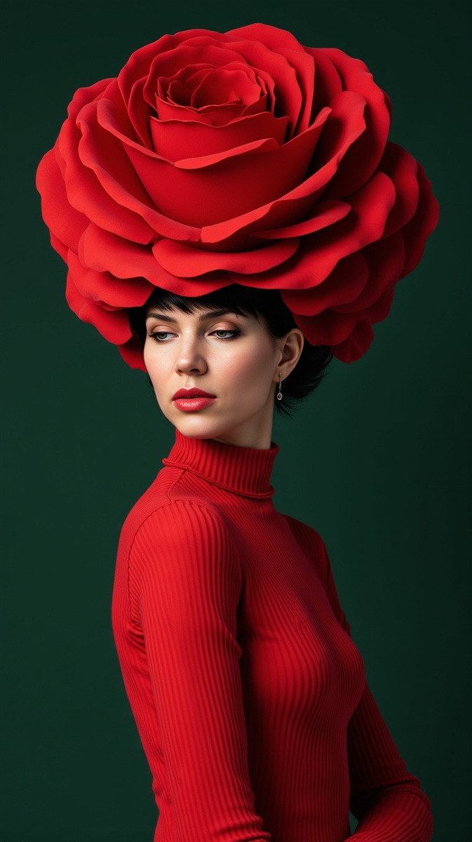 Промт: Fashionable portrait in profile, vertical frame from the chest up. The woman is depicted in a perfect lateral turn to the left, eyes closed, lips slightly pursed. She is wearing a sculptural headdress in the shape of a giant rose made of layered matte petals of rich red color. The petals are made of dense textiles, laid in a spiral, creating an architectural effect. Clothing — a tight red golf dress with a high neck, with a thin vertical texture of fabric, merges in tone and texture with the headdress, creating a monolithic silhouette. Makeup with an emphasis on red lips, blush and matte smooth skin. The background is dark green, deep, with a cold undertone (the shade is closer to fir or coniferous green, without a gradient, matte, without textures). The light is soft, lateral studio, creating a delicate shadow on the right side and emphasizing the plasticity of the fabric. There is an inscription at the bottom of the image: LOEWE is a large black logo, written in a serif font (