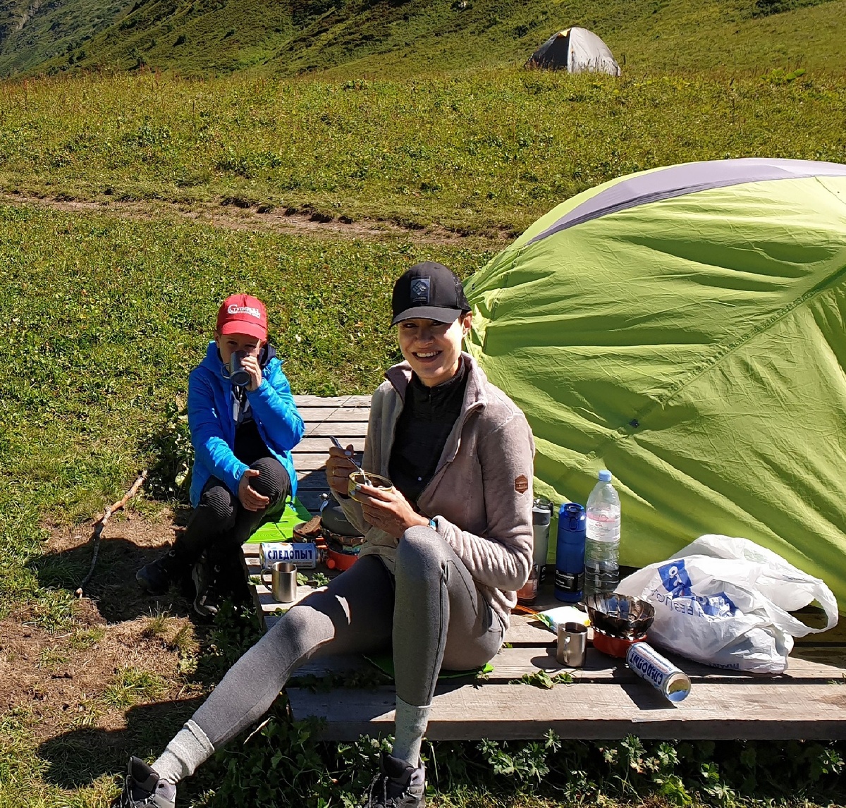 После легкого перекуса Анна прилегла на платформу на фоне нашей палатки и тента наших соседей, которые продолжали что-то есть под матерные крики своей «атаманши».