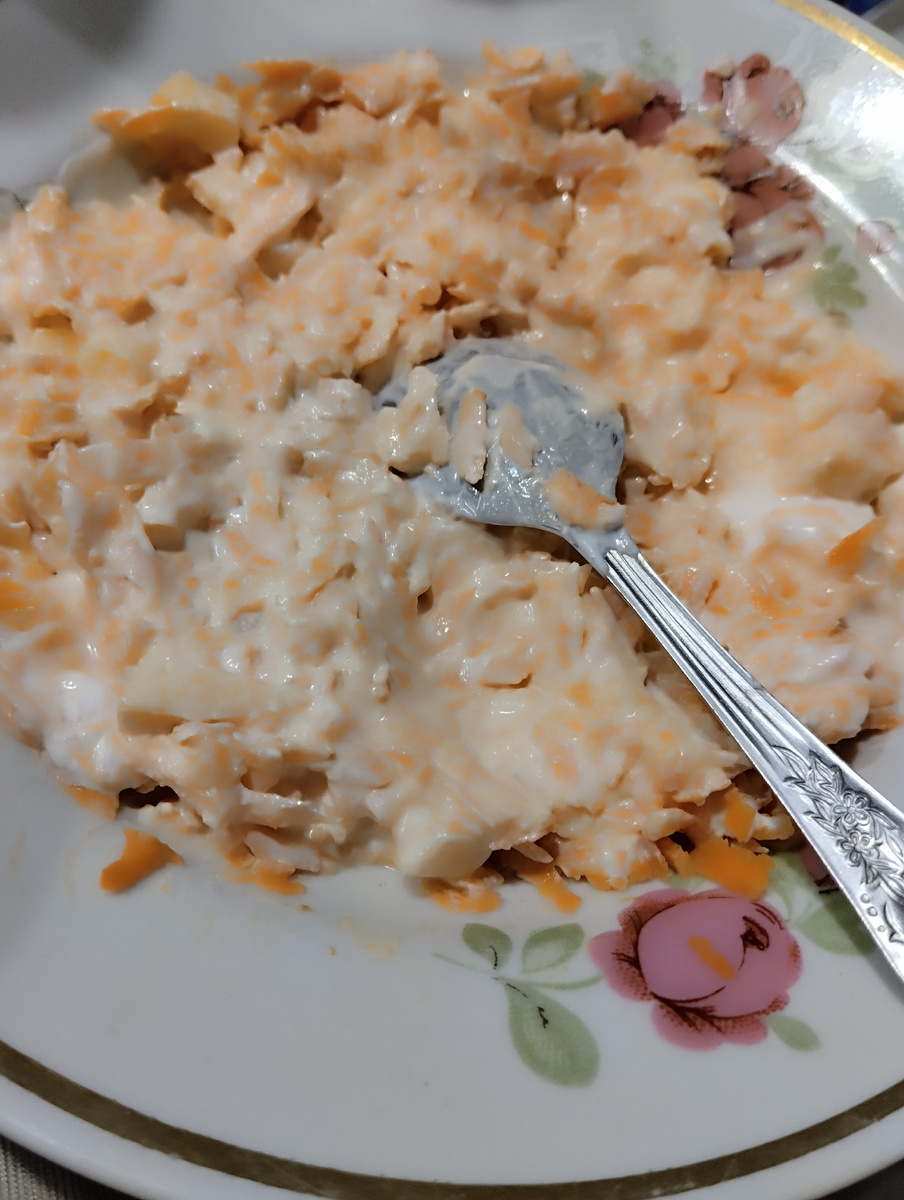 Сегодня поделюсь с вами рецептом из 4 ингредиентов. Всё! И при этом салата получается немало, целая тарелка! И конечно, порции можно и нужно увеличивать! Моем, чистим, натираем морковь на крупной тëрке. Моем яблоко. Можно тоже натереть. Или нарезать маленькими кубиками. Всё кладём в тарелку. Далее - если хотите сладкий салатик, то перемешиваем сметану с сахаром. Если не сладкий - сразу добавляем в тарелку. Хорошенько перемешиваем.