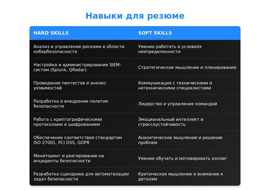 Обратите внимание на опыт работы с SOC-центрами и навыки анализа киберугроз.