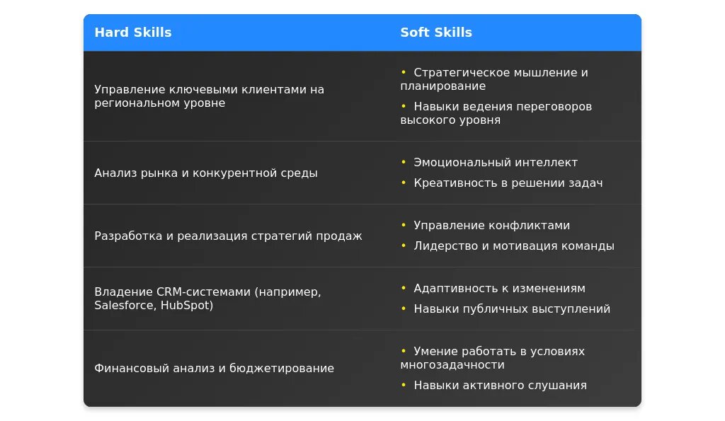 Управление ключевыми клиентами, навыки переговоров, аналитика продаж.