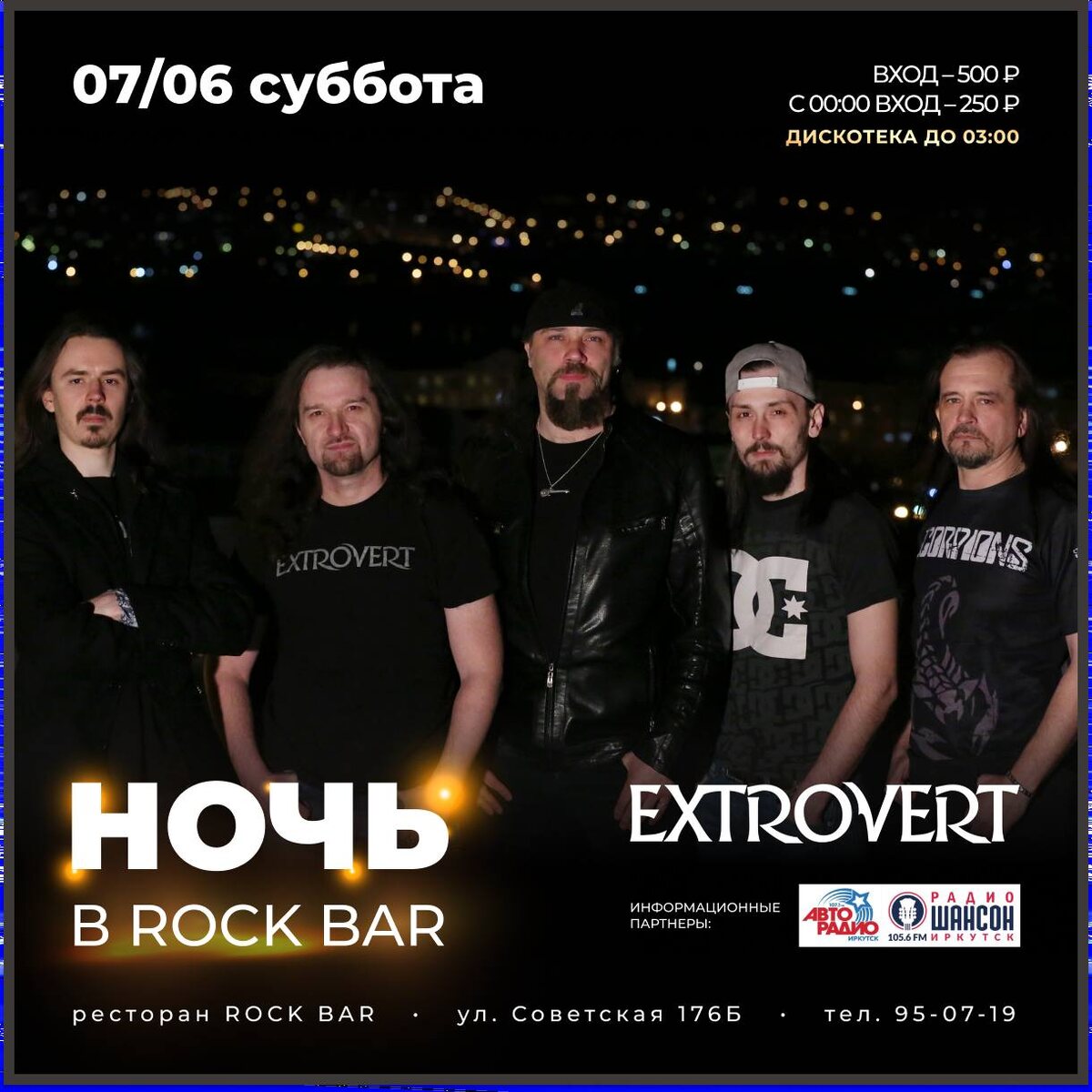 7 ИЮНЯ СБ. ”НОЧЬ В ROCK BAR” ГРУППА EXTROVERT & ДИСКОТЕКА Драйвовая ”НОЧЬ” субботы - на сцене рок-группа EXTROVERT . Bcex нас ждут любимые мировые рок-хиты в профессиональном исполнении, а в продолжении концерта - дискотека под музыку всех стилей и времен! Вход 500₽, с 00:00 - 250₽ ✅ Уважаемые гости! Бронирование столиков на «Ночь в Rock Bar” проводится на время с 19:00 и не позднее 22:00. Пожалуйста, если Вы опаздываете, позвоните или напишите нам, при опоздании более 15 минут без предупреждения бронь снимается. АС 18+ FC/DC Данная публикация носит исключительно информационный характер. 📞INFO/RV (с 15:00) +7-9148-95-07-19 💻 INFO/RV: www.rockbar38.ru 📍г.Иркутск, ул. Советская 176Б
