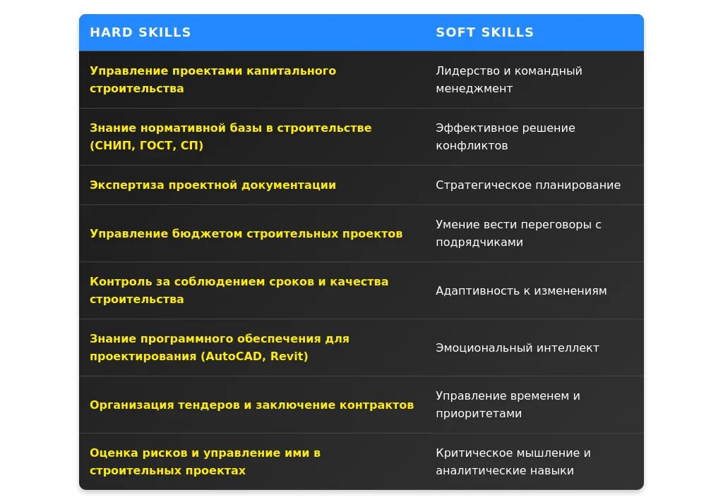Навыки, которые актуальны для должности (управление проектами, бюджетирование, контроль сроков и качества).