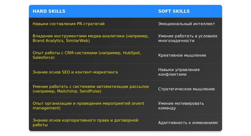 - Укажите продвинутые навыки (стратегическое планирование, управление кризисными коммуникациями).