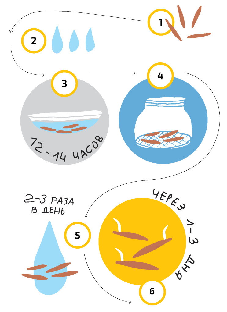 Что дальше? Промойте зерна холодной водой (2), замочите на 12–14 часов (3) (можно добавить в воду одну чайную ложку лимонной кислоты для дезинфекции). Слейте жидкость, переложите в банку с марлей (4) и промывайте 2–3 раза в день (5). Через 1–3 дня ждите ростков (6). Их, кстати, уже можно употреблять в пищу.