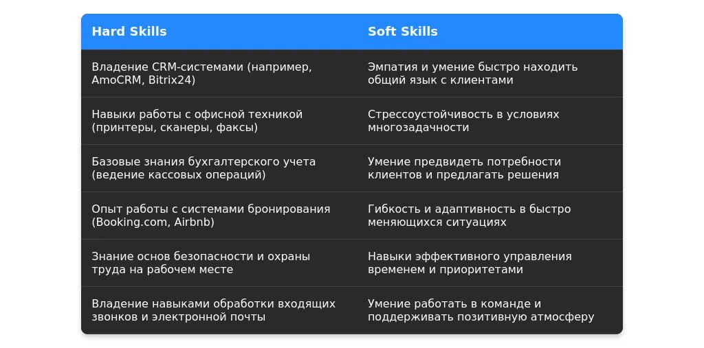 Для начинающих важно показать свой потенциал, мотивацию и базовые навыки, которые могут быть полезны на ресепшен.