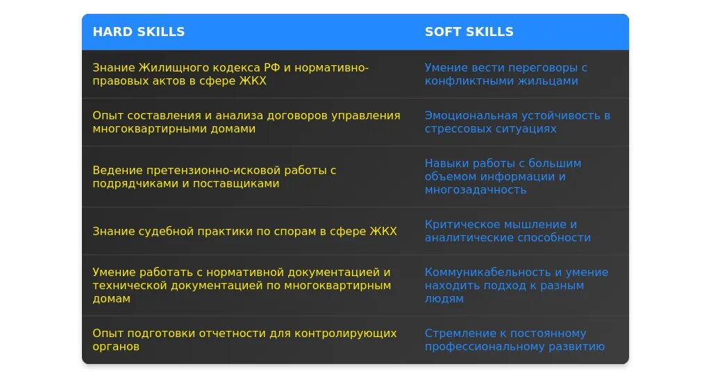 - Баланс: Сочетайте узкие и широкие навыки. Например: "Знание ЖКХ-законодательства и опыт управления юридическими проектами".