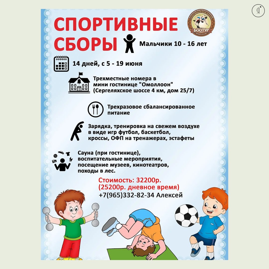 Детские спортивные сборы #ЛетнийЛагерь #ЗаГородом #МК Спортивный клуб «Боотур» организует двухнедельные детские спортивные сборы для ребят 10-16 лет В программе: - проживание в мини-гостинице «Омоллоон» (трехместные номера) - трехразовое сбалансированное питание - спортивная нагрузка, тренировки, ОФП на тренажерах - футбол, баскетбол, кроссы, эстафеты - сауна (при гостинице) - воспитательные мероприятия - посещение музеев, кинотеатров - походы в лес. С ребятами будут работать тренер с опытом работы, воспитатель с педстажем, повар 3 разряда 5-19 июня Сергеляхское шоссе 4 км, дом 25/7 32 200 руб. (без проживания – 25 200 руб.) +79653328234 Online Якутия | Подписаться