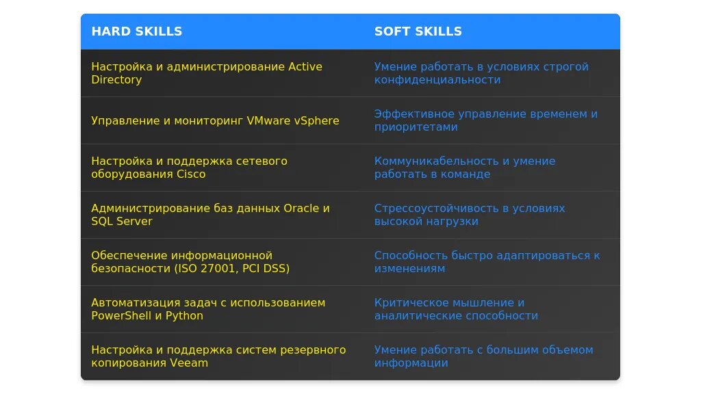 После: "Администрирование серверов на базе Windows Server и Linux, настройка сетевого оборудования Cisco, обеспечение информационной безопасности в соответствии с PCI DSS."