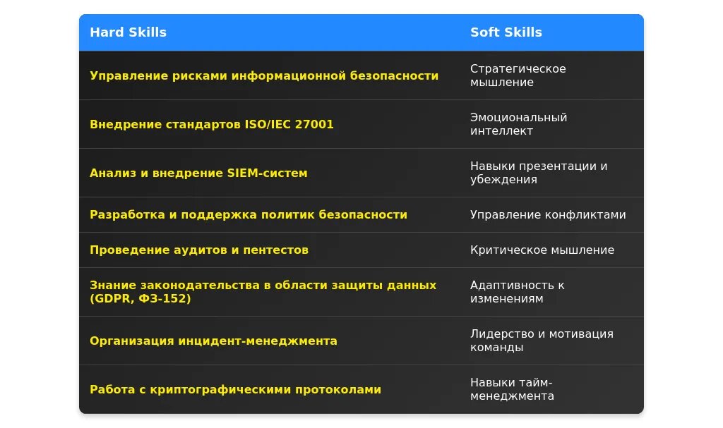 После: Управление проектами в сфере информационной безопасности, внедрение SIEM (Splunk, QRadar), знание стандартов ISO 27001 и GDPR.