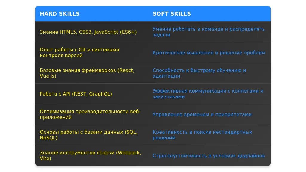 - Акцент на навыках: Основы HTML/CSS, JavaScript, базовые знания фреймворков.
