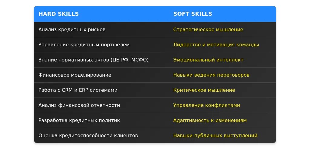 После адаптации: "Опыт работы с корпоративными клиентами, управление кредитными портфелями, знание законодательства в сфере кредитования."