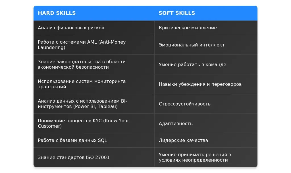 - Знание законодательства в области экономической безопасности (ФЗ №115, ФЗ №223).