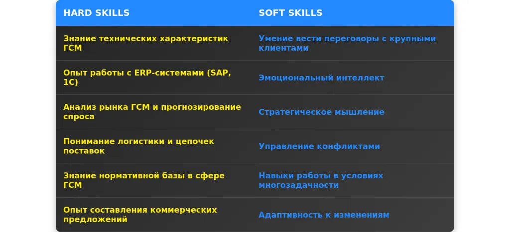 Навыки следует перегруппировать, выделяя те, которые соответствуют требованиям вакансии. Например, если вакансия требует знание рынка ГСМ, добавьте этот навык в начало списка.