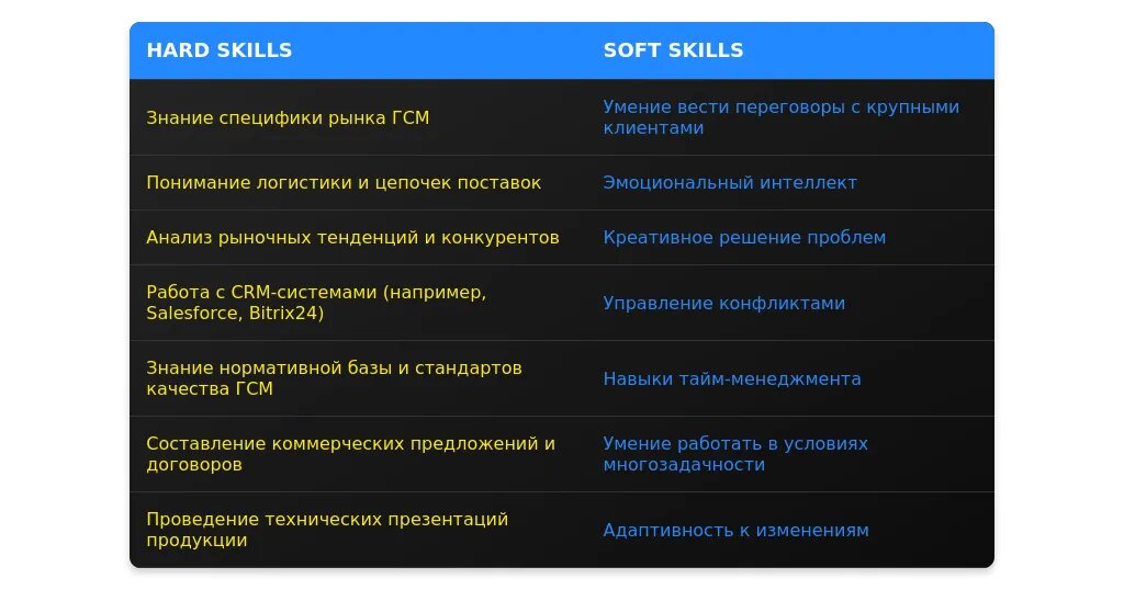После адаптации: "Знание CRM-систем, работа с крупными корпоративными клиентами, анализ рынка ГСМ."