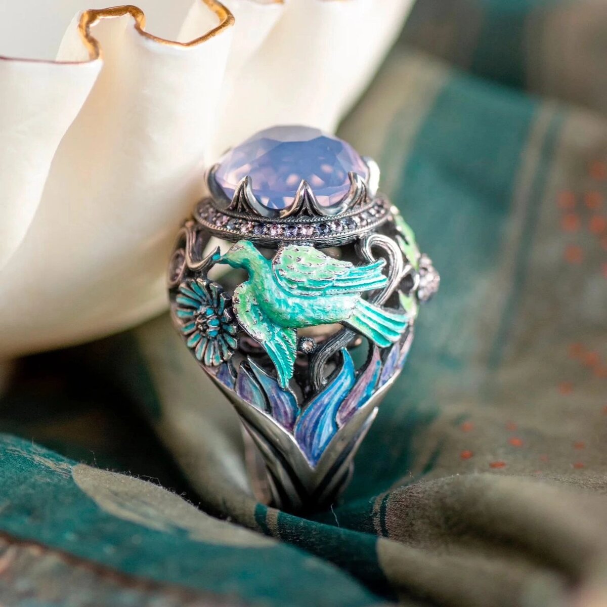 Сказочные образы и природные мотивы переплетаются в её работах, напоминая о многообразии мира вокруг нас. Кольцо «Средневековье», вдохновленное каменной резьбой европейских храмов, обладает особым характером, привнося в ювелирную коллекцию величие средневекового искусства.