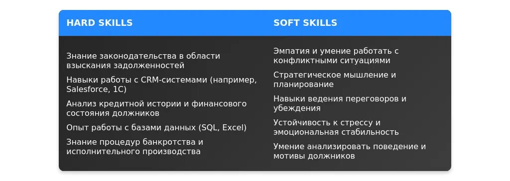 "Глубокое знание законодательства в области кредитования и взыскания задолженностей, включая судебные разбирательства."