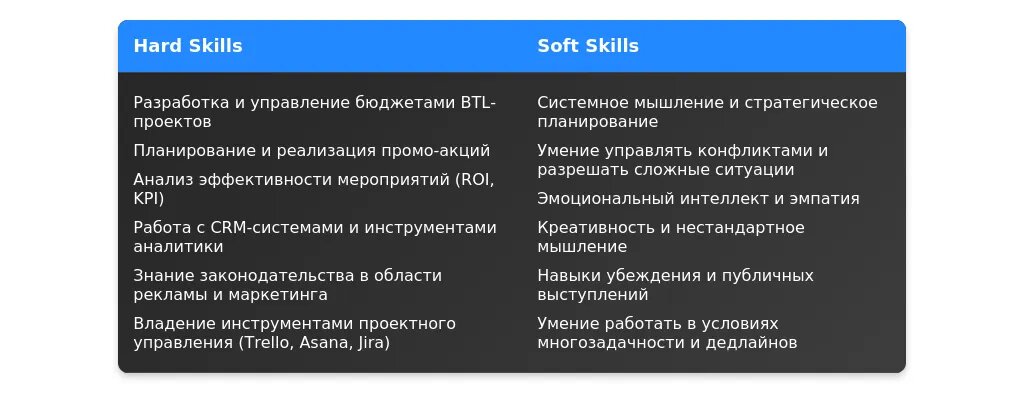 - Делайте акцент на навыки, которые можно применить в BTL-проектах (организация, коммуникация, аналитика).