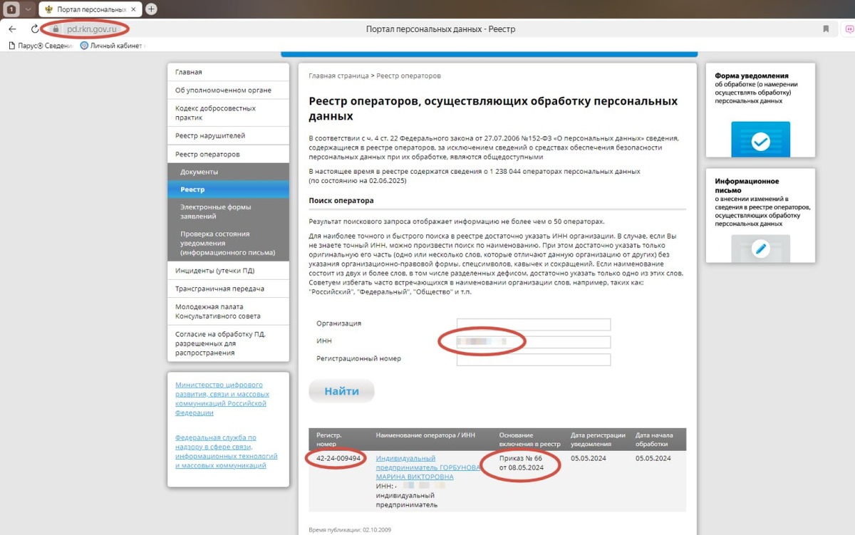 Как проверить регистрацию на портале Роскомнадзора Каждый человек, занимающийся обработкой персональных данных — будь то компания или индивидуальный предприниматель, обязан зарегистрироваться в реестре операторов персональных данных Роскомнадзора. Если же возникают сомнения относительно своей регистрации, существует простой способ убедиться в наличии такой записи. Шаги проверки регистрации оператора персональных данных: ✅ .Зайдите на официальный сайт Роскомнадзора Официальная страница ведомства доступна по адресу https://rkn.gov.ru/. ✅ Откройте реестр операторов ПДн На главной странице перейдите в раздел "Реестр операторов обработки персональных данных". ✅ Используйте форму поиска Для удобства пользователей предусмотрена форма поиска по следующим параметрам: - Название организации/ФИО индивидуального предпринимателя, - Регистрационный номер оператора, - Адрес местонахождения юридического лица или ИП. Заполните любое из полей, которое соответствует вашей ситуации, и нажмите кнопку