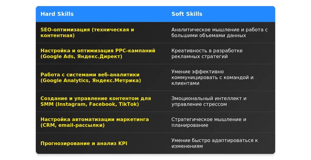 - Сделайте акцент на базовых навыках (SEO, контекстная реклама, аналитика).