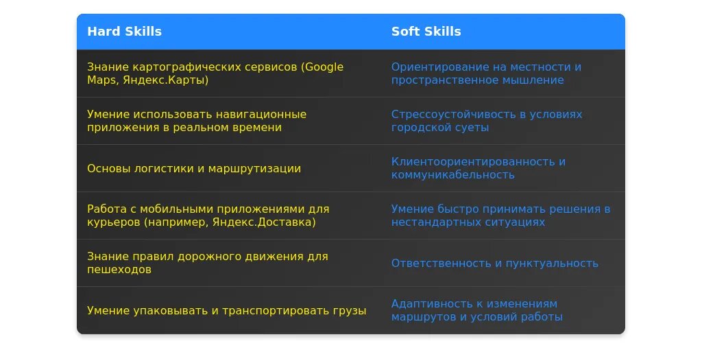 После адаптации: "Знание города, работа с навигационными приложениями (Google Maps, Яндекс.Навигатор), физическая выносливость."
