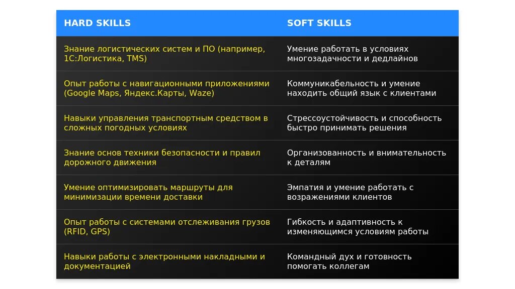 ✅ Пример 1: Уверенное владение навигационными системами (Google Maps, Яндекс.Навигатор), опыт работы в условиях интенсивного городского трафика.