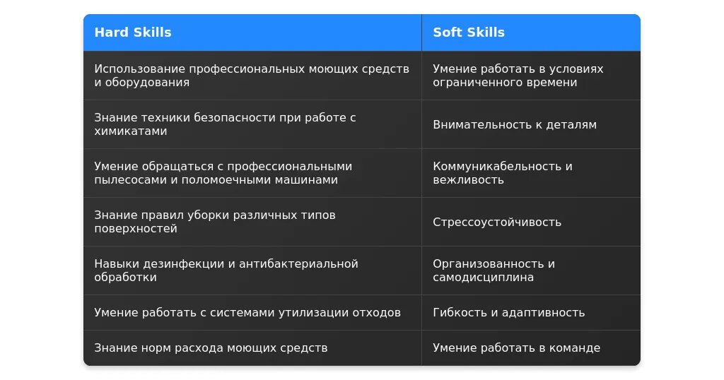 Перегруппируйте навыки, чтобы они соответствовали требованиям вакансии. Выделите ключевые компетенции, такие как работа с оборудованием или знание стандартов уборки.