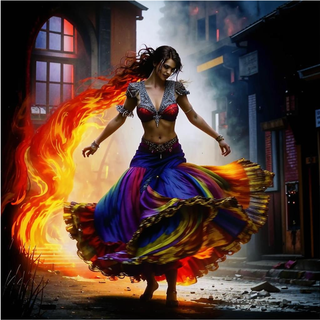Ляна не остановилась. Она ускорилась, рванув на себе остатки платья. Лоскуты ткани — чёрные, красные, золотые — взметнулись в воздух, превратившись в стаю воронов. Её тело, иссеченное царапинами и шрамами, сияло в огненном свете, как жаждущий крови ритуальный нож. Она била каблуками в землю, выбивая искры, кружилась так, что казалось — вот-вот разорвется на части. Но это был не танец смерти. Это был танец свободы.