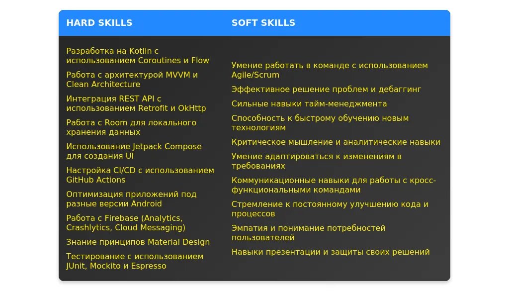 Какие качества и навыки выделять: технические навыки (Kotlin, Java, Android SDK), обучаемость, мотивация.