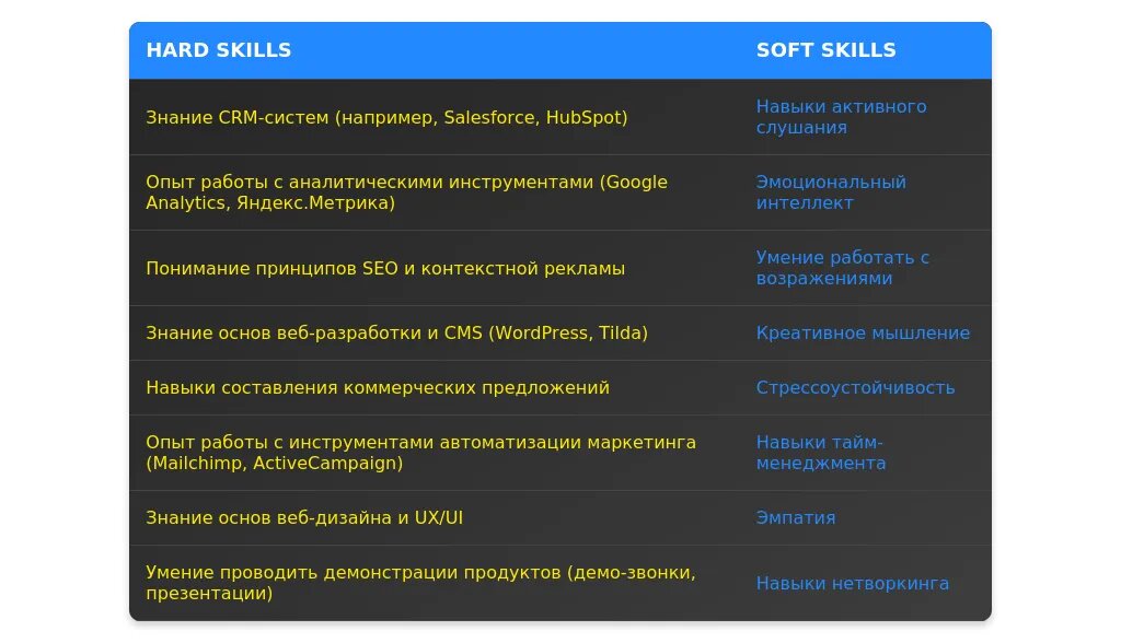 После адаптации: "Работа с CRM, управление продажами, анализ KPI, знание веб-технологий."