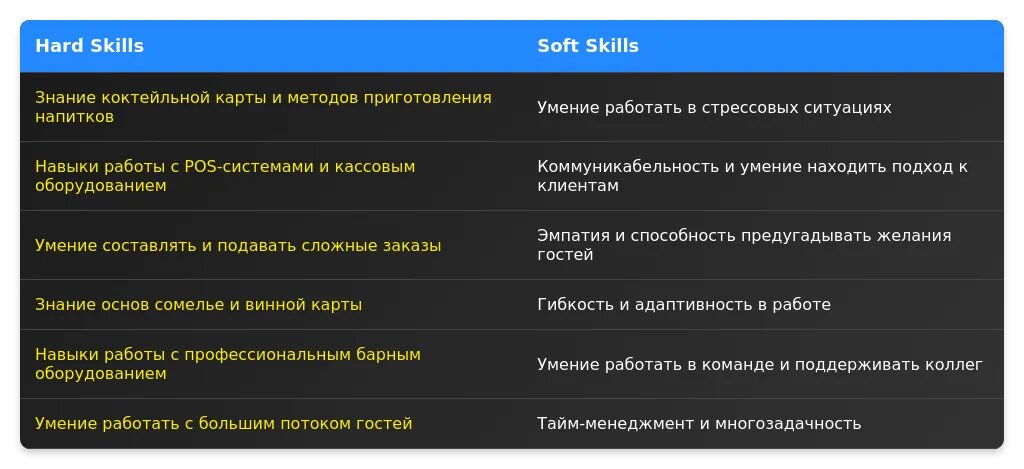 Пример 2: Требование "знание основ миксологии" указывает на необходимость выделить соответствующие навыки в резюме.