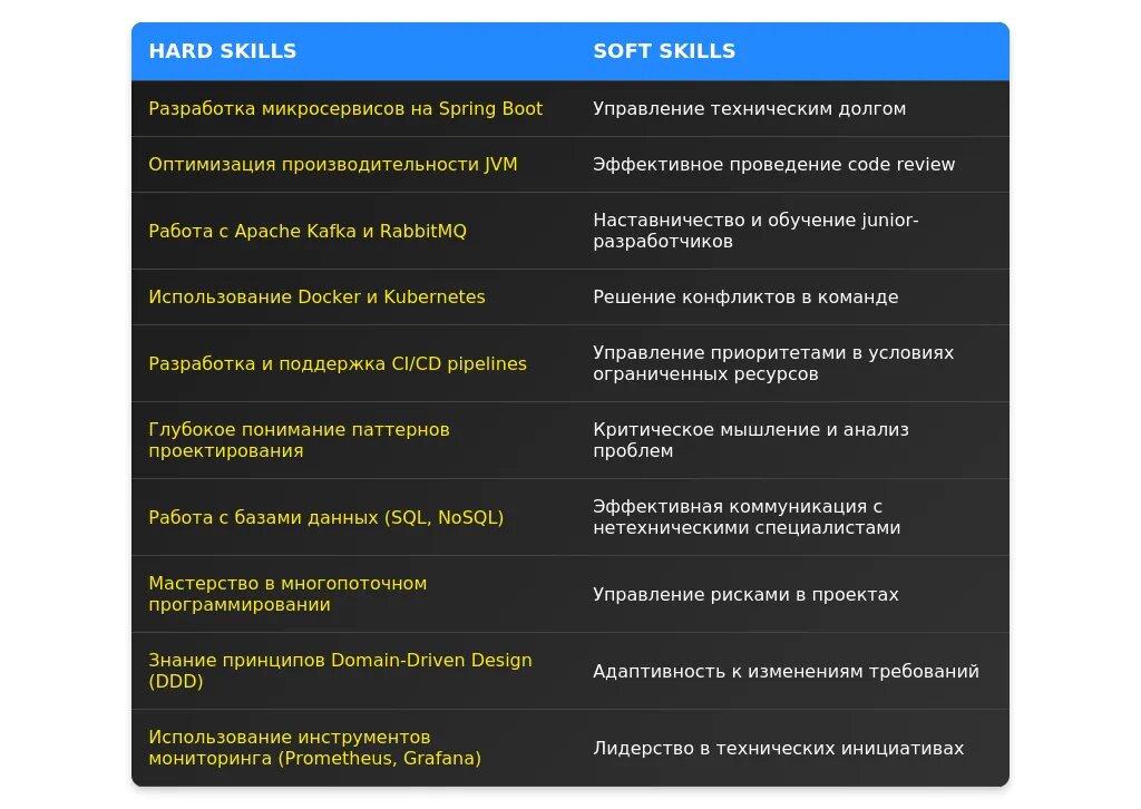 "Более 10 лет опыта в разработке на Java. Руководил командой из 15 человек в рамках проекта для крупного банка, где успешно внедрил микросервисную архитектуру. Специализируюсь на масштабируемых и отказоустойчивых системах."