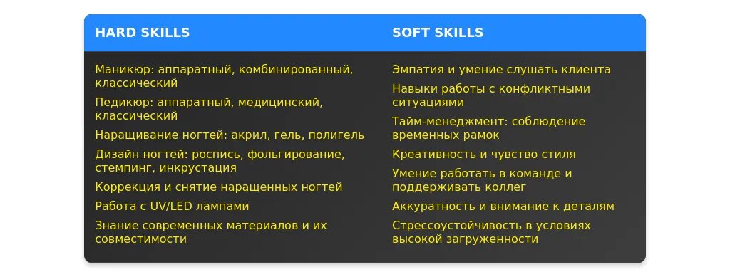 Например, вместо "знание классического маникюра" укажите "владение современными техниками маникюра, включая аппаратный и комбинированный".