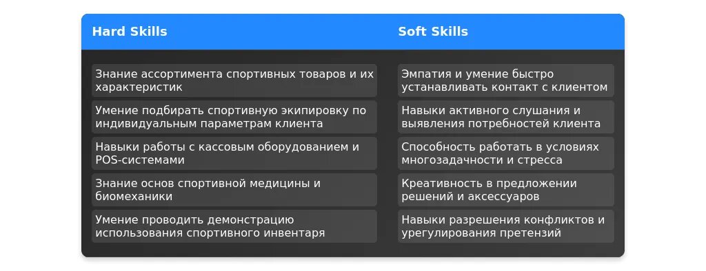 Пример 3: "Знание ассортимента спортивных товаров и навыки подбора инвентаря под потребности клиентов."