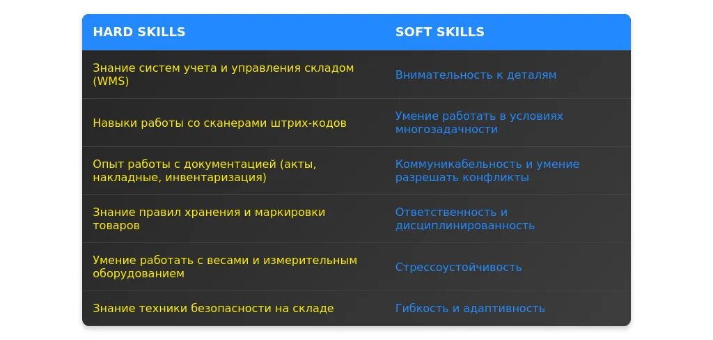 Ошибка: "Коммуникабельность, стрессоустойчивость." (без уточнения, как эти навыки применялись на складе)