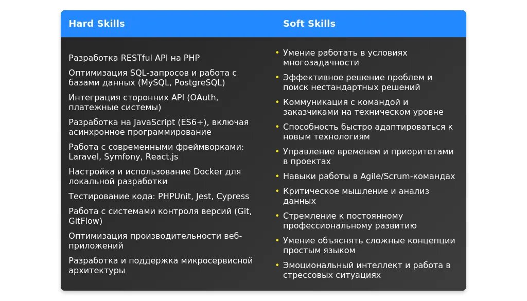 При анализе вакансии для web-программиста (PHP JS) важно выделить ключевые требования, которые работодатель считает обязательными. Это могут быть конкретные технологии (например, PHP 8, Laravel, React), опыт работы с базами данных (MySQL, PostgreSQL), знание инструментов (Git, Docker) и soft skills (работа в команде, Agile). Обращайте внимание на формулировки: если работодатель использует слова "обязательно", "требуется", это сигнализирует о важности навыка. Желательные требования часто сопровождаются словами "будет плюсом", "приветствуется".