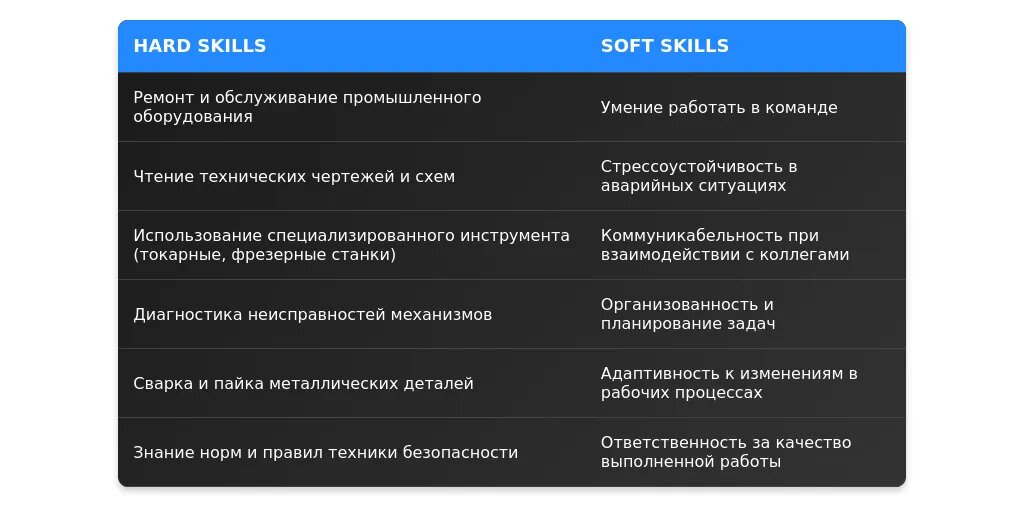 - Ключевые навыки (например, ремонт оборудования, диагностика неисправностей).