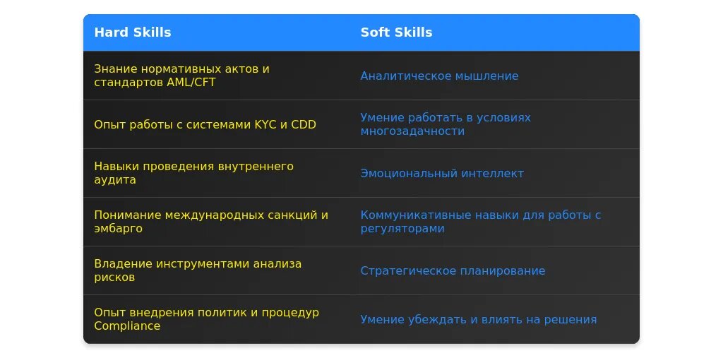После адаптации: "Знание AML, KYC, GDPR; опыт взаимодействия с регуляторами; навыки разработки compliance-политик."