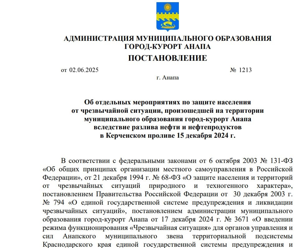 Мэр Анапы подписал постановление от 02.06.2025 №1213 «Об отдельных мероприятиях по защите населения от чрезвычайной ситуации, произошедшей на территории муниципального образования город-курорт Анапа вследствие разлива нефти и нефтепродуктов в Керченском проливе 15 декабря 2024 г». Основные положения: ▪️Территории проведения работ по ликвидации чрезвычайной ситуации и её последствий вдоль береговой линии побережья Черного моря в границах муниципального образования город-курорт Анапа определены как иная опасная зона). Даны поручения заместителям: ▪️Обозначить границы опасной зоны путем её ограждения. ▪️Обеспечить доступ в опасную зону лиц, участвующих в работах по ликвидации ЧС, а также лиц, осуществляющих на данных территориях трудовые или служебные обязанности. ▪️Информировать население об ограничении доступа в опасную зону, в том числе посредством установки информационных стендов. ▪️Хозяйствующим субъектам из числа пляжепользователей и водопользователей организовать работу по огра