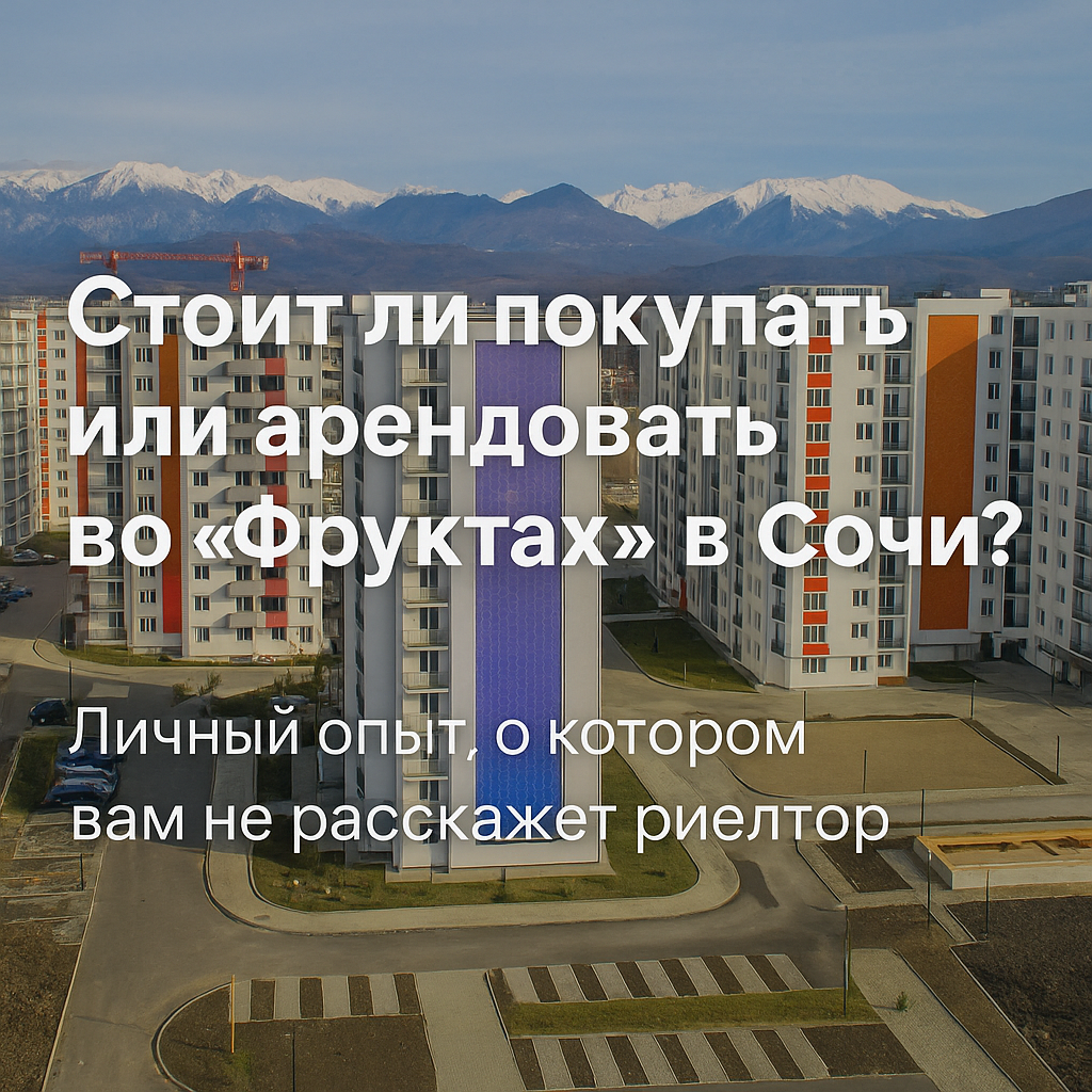 Когда я только начинал задумываться о переезде в Сириус, о ЖК «Фрукты» слышал так часто, что казалось — даже чайка на набережной обсуждает цены на однушки в «Апельсиновом». Объявления рисовали идеальную картинку: яркие корпуса, сочные названия, ухоженные дворы и спортплощадки, близость к морю, вложение века. Но мы-то знаем: за любыми рекламными фасадами скрывается реальная, не всегда глянцевая жизнь.